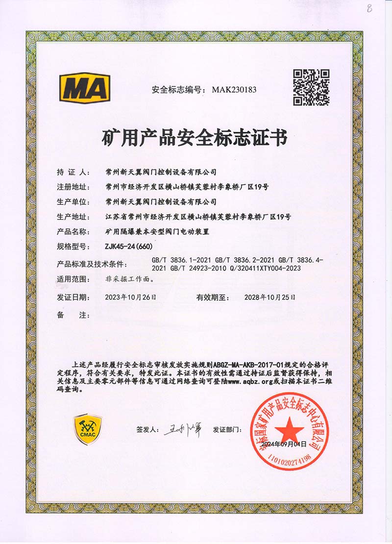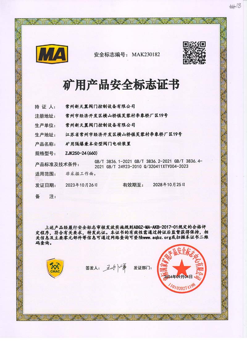 礦用產品安全標志證書ZJK180-24(380)