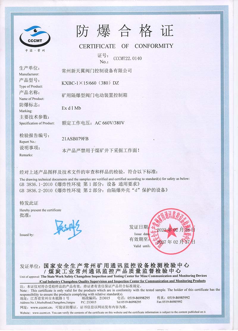 隔爆控制箱 中國國家強制性產品認證證書111.2